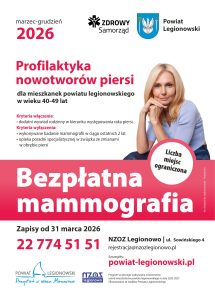 Mieszkanki powiatu ponownie mogą skorzystać z bezpłatnych badań przesiewowych w kierunku nowotworów piersi. Zapraszamy panie w wieku 40-49 lat, dla których Powiat Legionowski przygotował bezpłatne badania mammograficzne. Badania wykonywane są w NZOZ „Legionowo” przy ul. Sowińskiego 4.